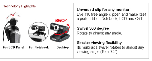 - Sensor de Imagen: CMOS de 100 KPixeles. - Tipo de Foco: Manual. - Base Rotatorio: Gira hasta 360 grados. |