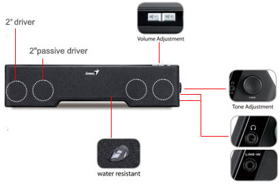 Los Parlantes Genius SP-i355 han sido diseñados pensando en los usuarios de Computadores de Escritorio con monitores de hasta 19 Pulgadas. El modelo viene con dos pequeños conos de altavoz de dos pulgadas, cada uno con una potencia de 5 Watts.